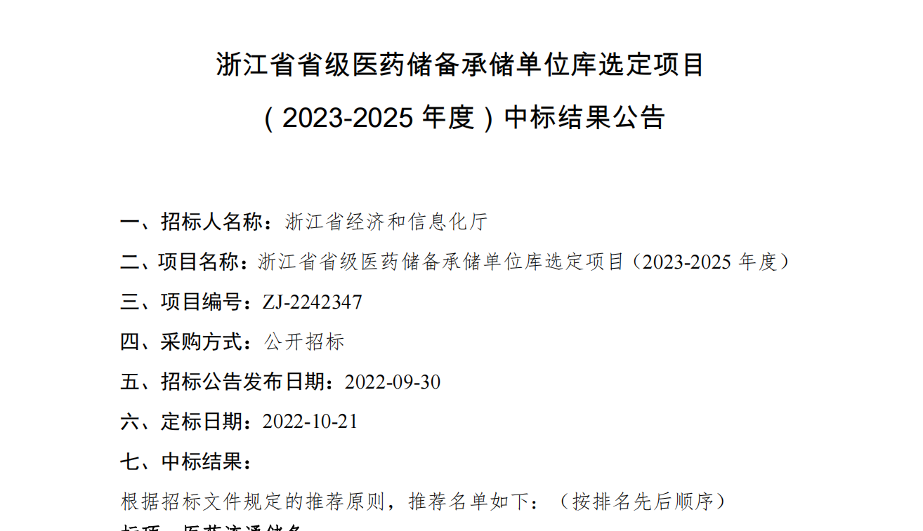 近日,迪安診斷旗下產品公司——杭州迪安生物技術有限公司,順利中標《浙江省省級醫藥儲備承儲單位庫選定項目(2023-2025 年度)》標項三:品種32、33、34、35、36、40、41。此次,迪安生物應標的所有產品均順利入圍。